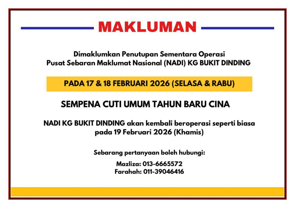 Untuk makluman, NADI Kg Bukit Dinding akan ditutup pada 17 & 18 Februari 2026 (Selasa & Rabu) sempena cuti umum Tahun Baru Cina.