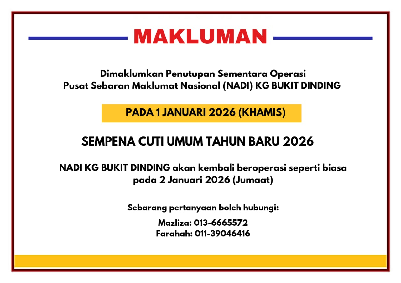 Assalamualaikum dan Salam Sejahtera. Untuk makluman, NADI Kg Bukit Dinding akan ditutup pada 17 & 18 Februari 2026 (Selasa & Rabu) sempena cuti umum Tahun Baru Cina. NADI Kg Bukit Dinding akan beroperasi seperti biasa bermula 19 Februari 2026 (Khamis). […]