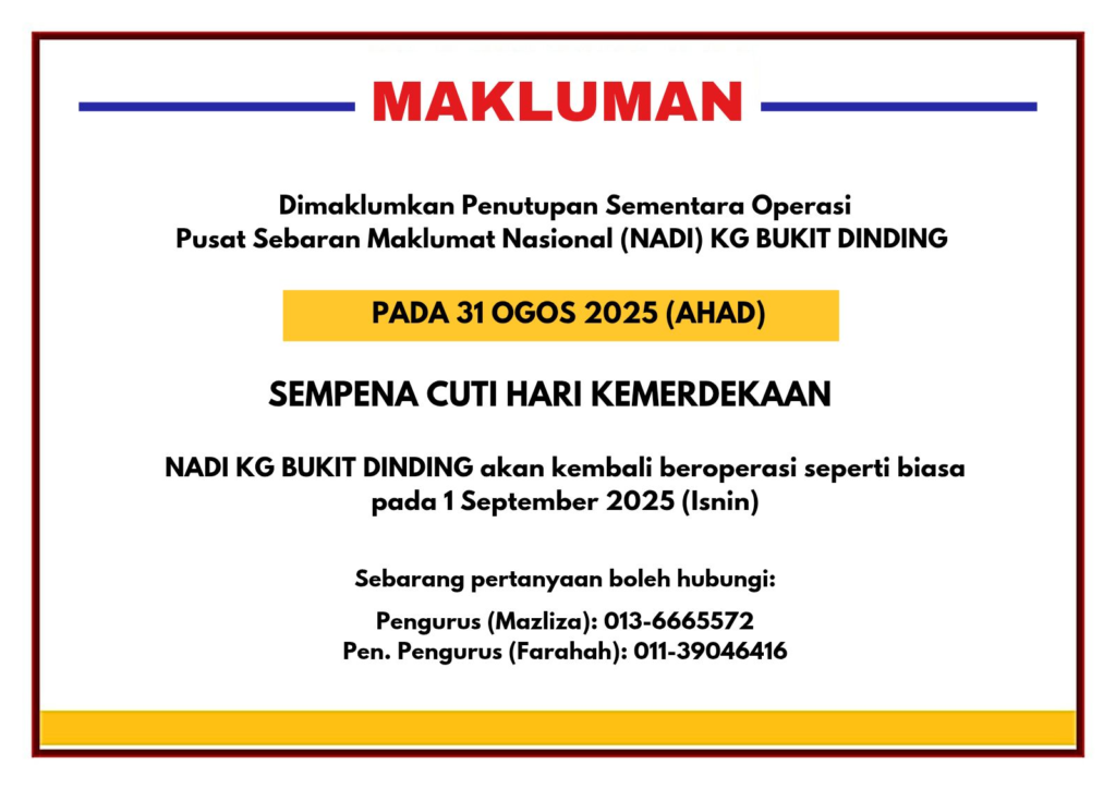 Untuk makluman, NADI Kg Bukit Dinding akan ditutup pada 31 Ogos 2025 (Ahad) sempena cuti Hari Kemerdekaan.